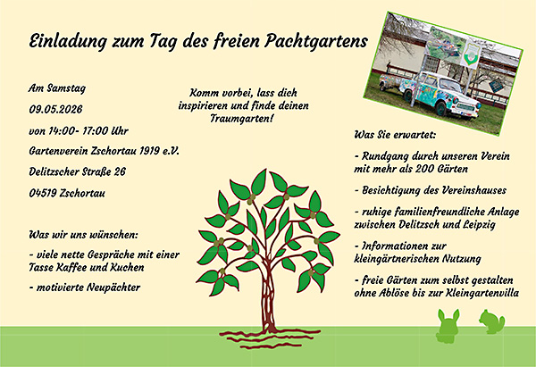 Wir sind ein Gartenverein in Zschortau. Zschortau befindet sich zwischen Leipzig und Delitzsch an der Bundesstraße 184. Seit der Gründung unseres Kleingartenvereins am 17. August 1919 bietet der Kleingarten für uns eine sinnvolle Freizeitbeschäftigung, selber Geerntetes schmeckt ja bekanntlich besser als Gekauftes.